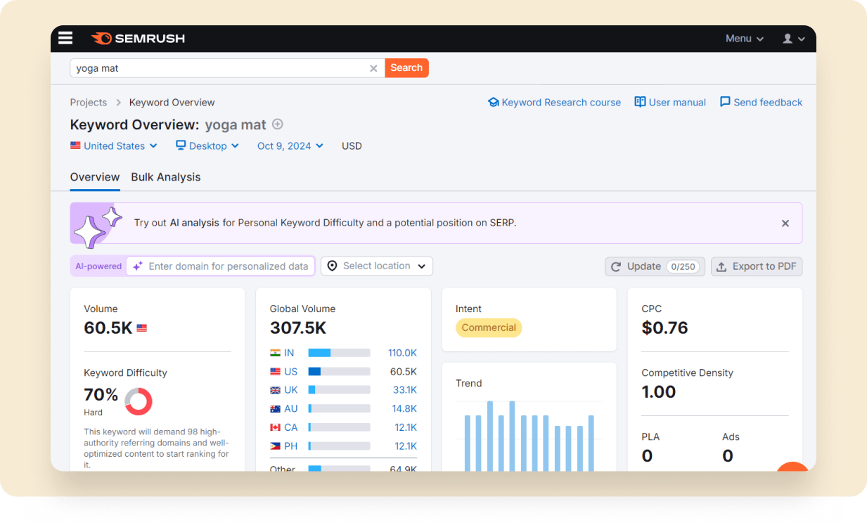 - Choose a focus keyword: each blog post should target one main keyword. For example, if you’re writing a guide about yoga mats, your keyword might be “best yoga mats for beginners.”