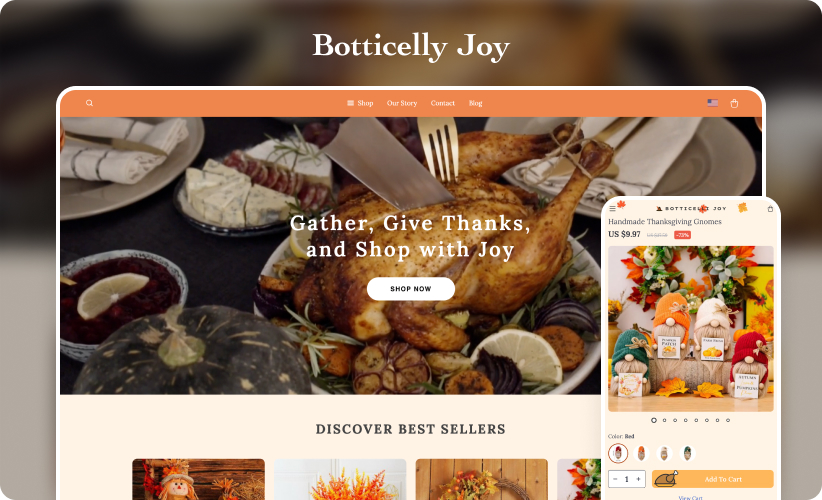 There’s no better way to show your customers that you’re in the holiday spirit than by giving your store a cozy, inviting look. Our Thanksgiving-themed design is just what you need to create that heartfelt, seasonal vibe – think fall colors, friendly vibes, and all the festive charm. You can create a shopping experience that feels like a Thanksgiving gathering, helping you connect with customers and boost sales.