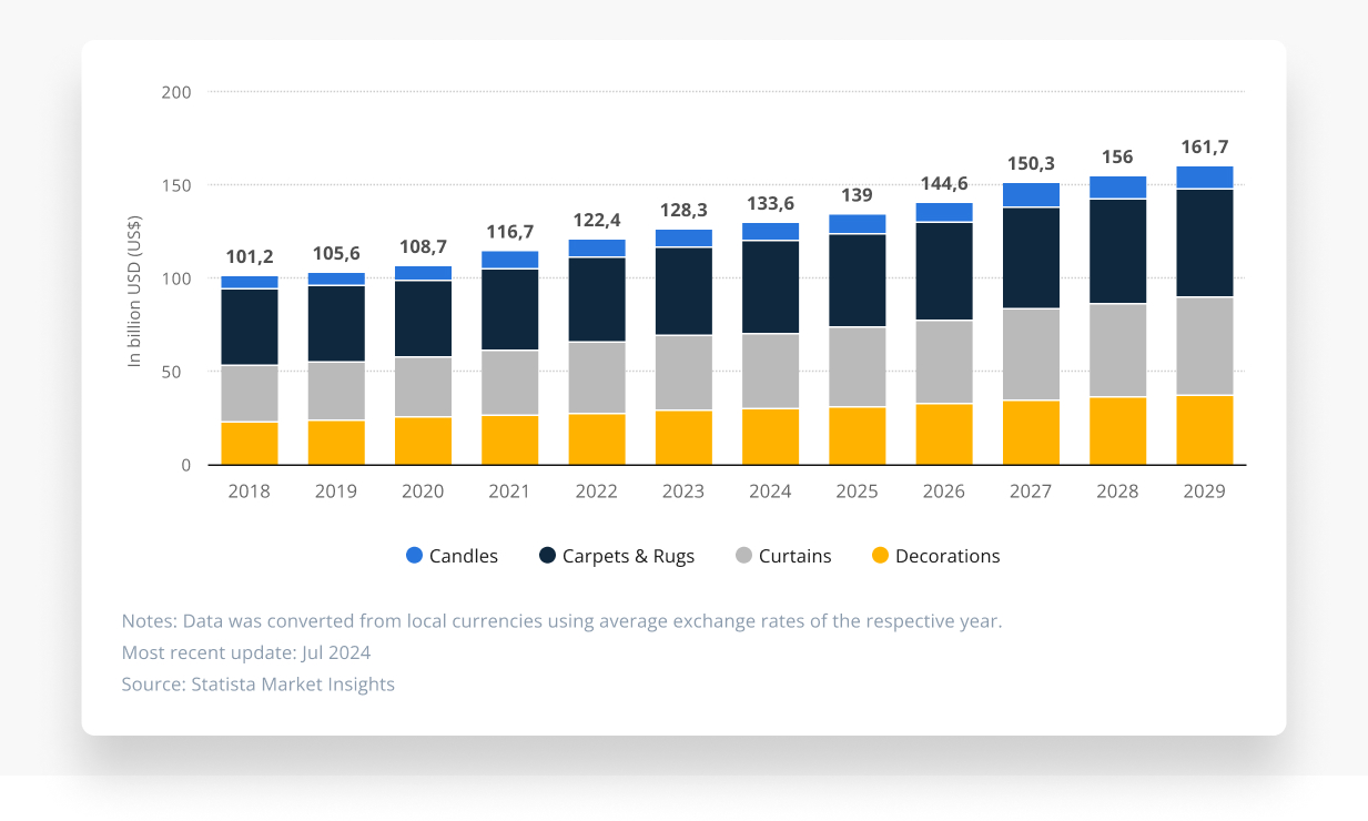 The Home & garden niche remains a vibrant sector in the ecommerce landscape, consistently attracting a diverse audience interested in improving their living spaces. According to Statista, in 2024, the revenue in the worldwide Home Décor market segment is expected to reach an impressive US$133.60 billion. Furthermore, this market is projected to experience steady growth, with an annual increase of 3.89% (CAGR 2024-2029), demonstrating robust potential for businesses looking to enter or expand within this niche.