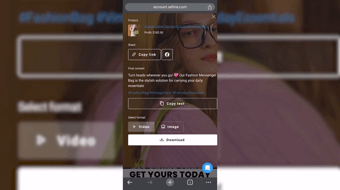 In your dashboard, select the product post you’d like to share, choose the format (image or video), and click the large white button to download it to your phone or other device: