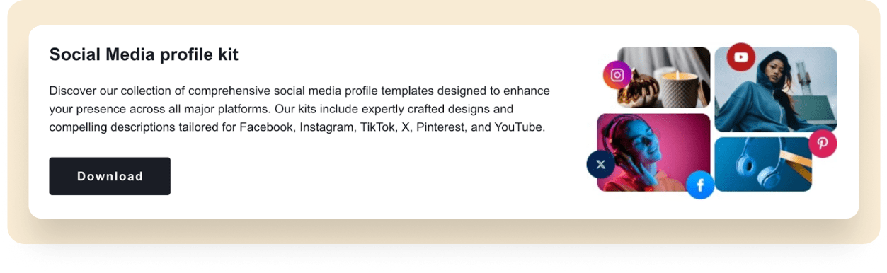 Sellvia’s tool offers a full set of features, including the Social Media Profile Kit – a collection of ready-made templates for Facebook, Instagram, TikTok, X, Pinterest, and YouTube. These templates are designed to increase your brand’s visibility and appeal on social media with eye-catching designs and engaging descriptions.
