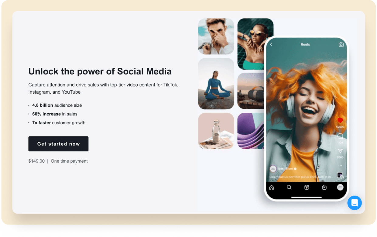 Boost your sales by enhancing your social media presence with professional content. Our tools includes ready-to-post videos and custom designs that can help you increase your sales fivefold through effective social media strategies.
