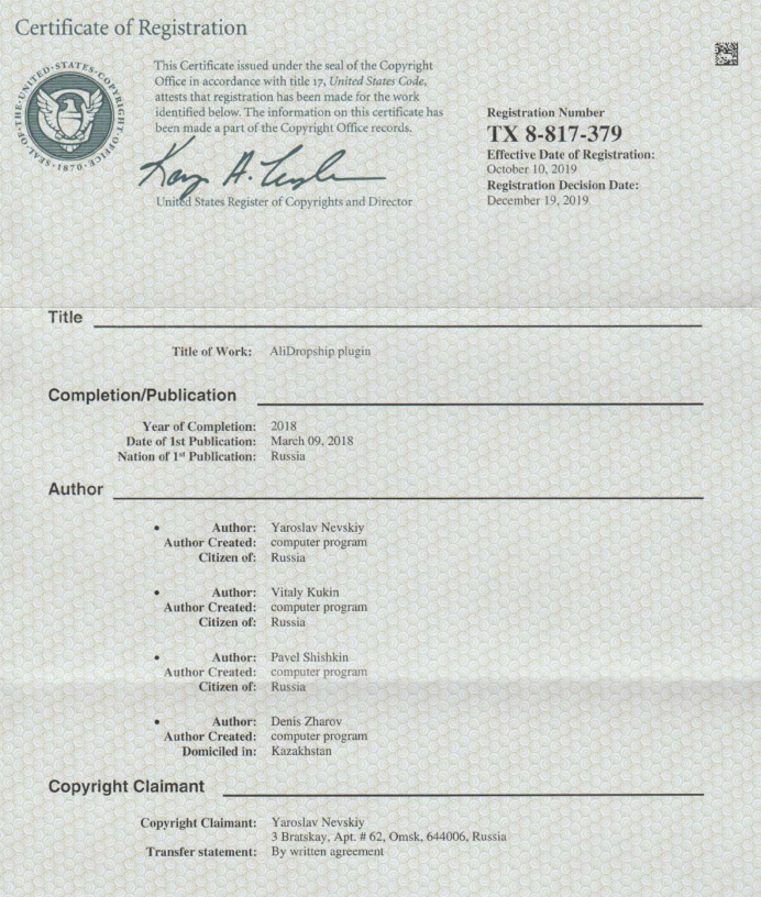 UNAUTHORIZED copying and using of AliDropship plugin and its source code is illegal and prohibited. The United States Copyright law protects the AliDropship plugin and the intellectual rights of its authors.