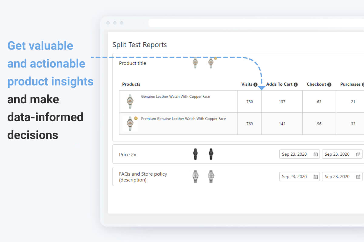 In the Reports tab, you’ll see detailed reports on how your products perform. No need to dig into heaps of information in your Google Analytics account. The Split Test add-on gathers the metrics that really matter to your business.