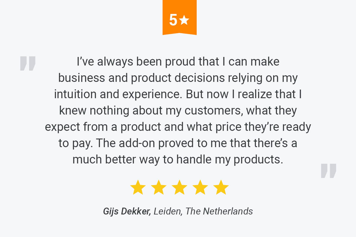 Set up an experiment just in a few moments to test your product hypotheses. The add-on will send each version to half your audience to see what converts better. For example, traffic is split 50/50 if you test 2 products against each other (i.e. 50% of users will see your original product, 50% will land on its variant). If you compare 4 products, each variant will get 25% of traffic.