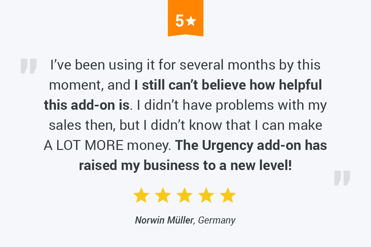 With Urgency, you can easily replicate the feeling of a popular shop where products are flying off the shelves. Benefit from the clients’ fear to miss out a good deal, create a sense of urgency and boost your revenue using this simple and convenient solution.