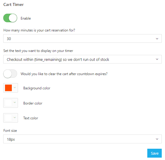 You can configure almost all the elements of your cart countdown timer. Select how long your cart reservation will be valid for, then pick the text and font you want to be displayed (or even write your own). The timer will appear on shoppers’ shopping cart pages, motivating them to purchase ASAP.